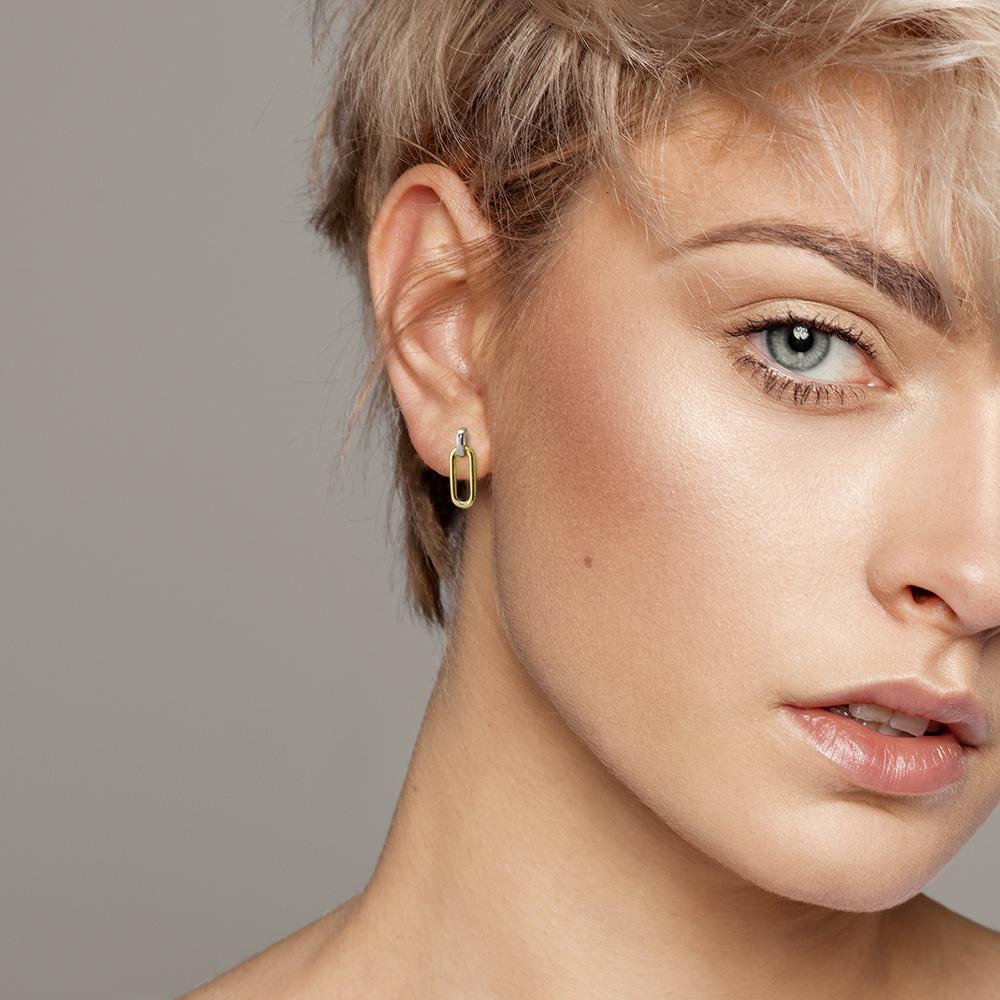 Stylish women's drop earrings crafted in silver with a modern two-tone design. Featuring a sleek silver hoop connecting to a polished gold-toned elongated link, these earrings offer versatile elegance for any occasion. Lightweight and comfortable for all-day wear.