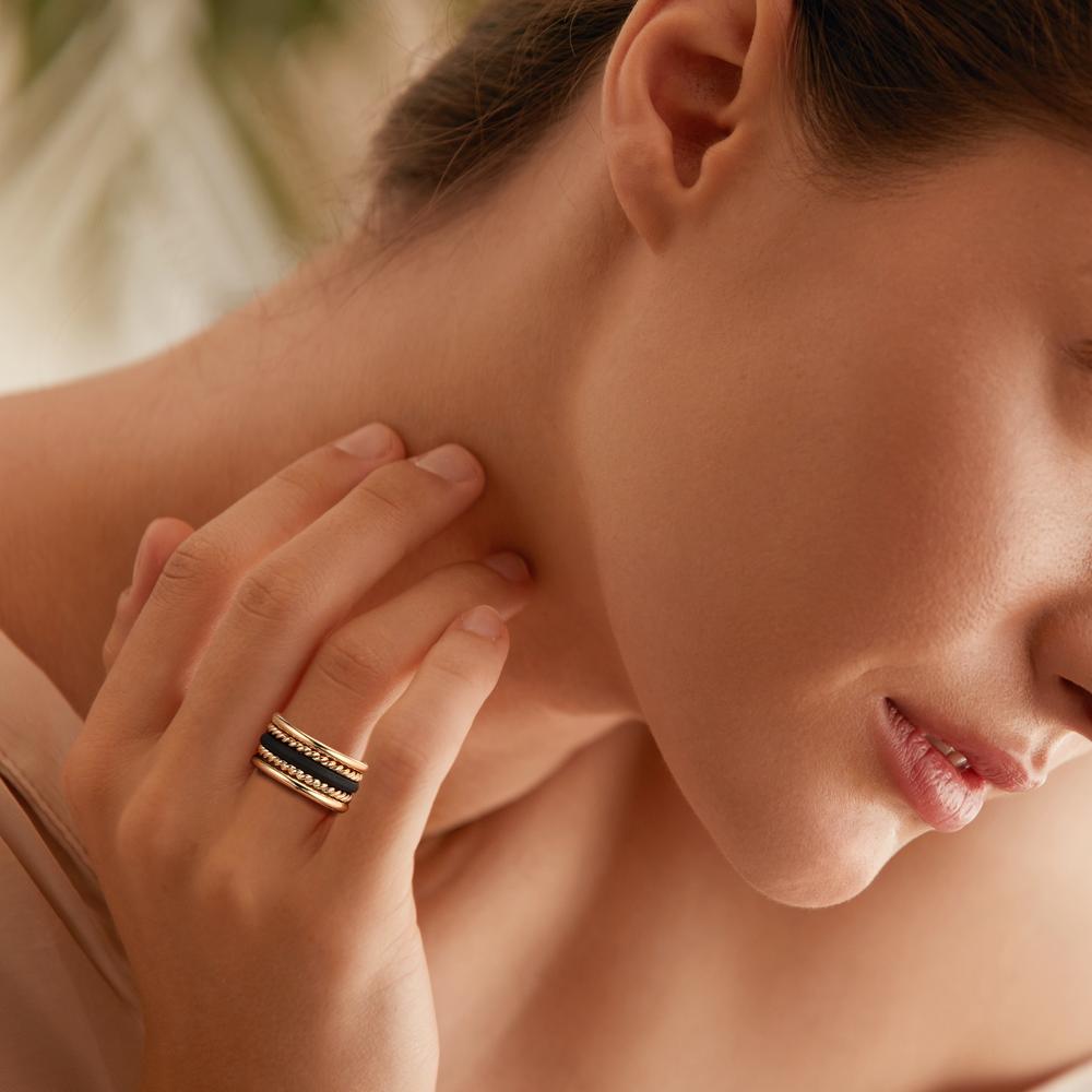 This elegant women's ring features a unique combination of polished gold-tone bands and twisted rope details, accented with a sleek black strip for a modern touch. A stylish accessory that adds sophistication and flair to any outfit, perfect for everyday wear or special occasions.